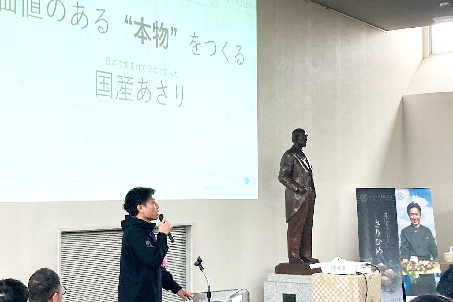 講演では、 人材会社が養殖事業をはじめたきっかけ、そして完全国産あさり「さりひめ」誕生の背景、種苗からの養殖、そして出荷まで一貫して行う養殖体制。