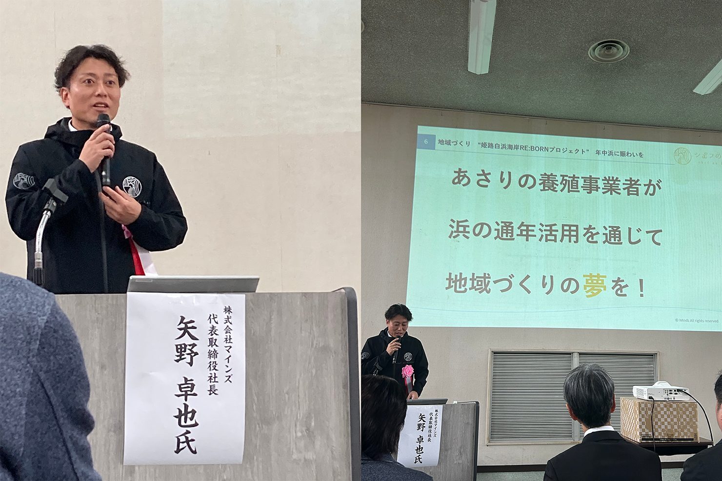単なる「養殖」や「商品開発」にとどまらず、地域の海を守り、次世代へつなぐための実践として、マインズが進める姫路白浜海岸リボーンプロジェクトの想いをお話ししました。